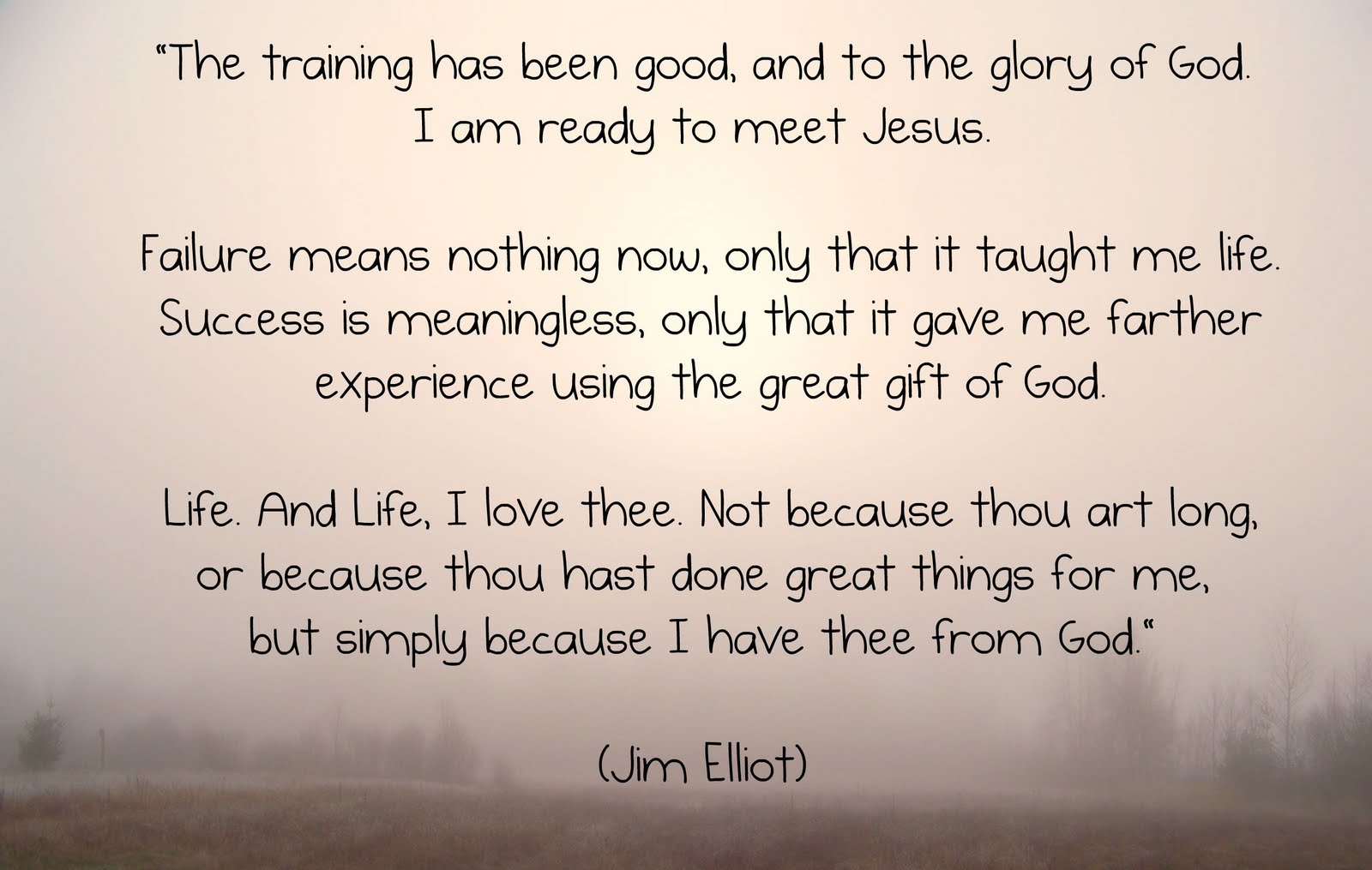 /Jim Elliot didn't write this in his journal after he had gotten to the mission field. He didn't write it right before he became a martyr. He wasn't even married yet, nor did he know that he would be one day. He wrote it before he even boarded the ship to sail to Ecuador. It was in a season of waiting and quietness that he penned this excerpt...no dreams fulfilled, nothing extremely great had been accomplished.